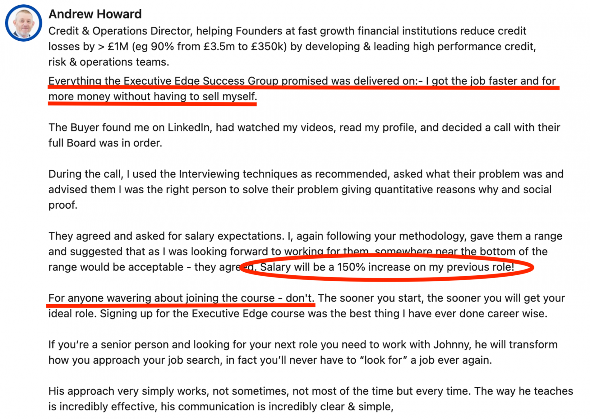"Everything the Executive Edge Success Group promised was delivered on:- I got the job faster and for more money without having to sell myself"