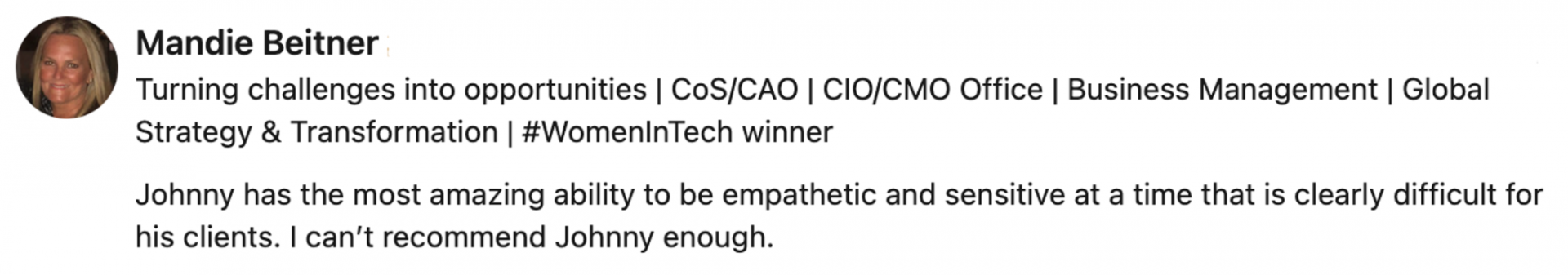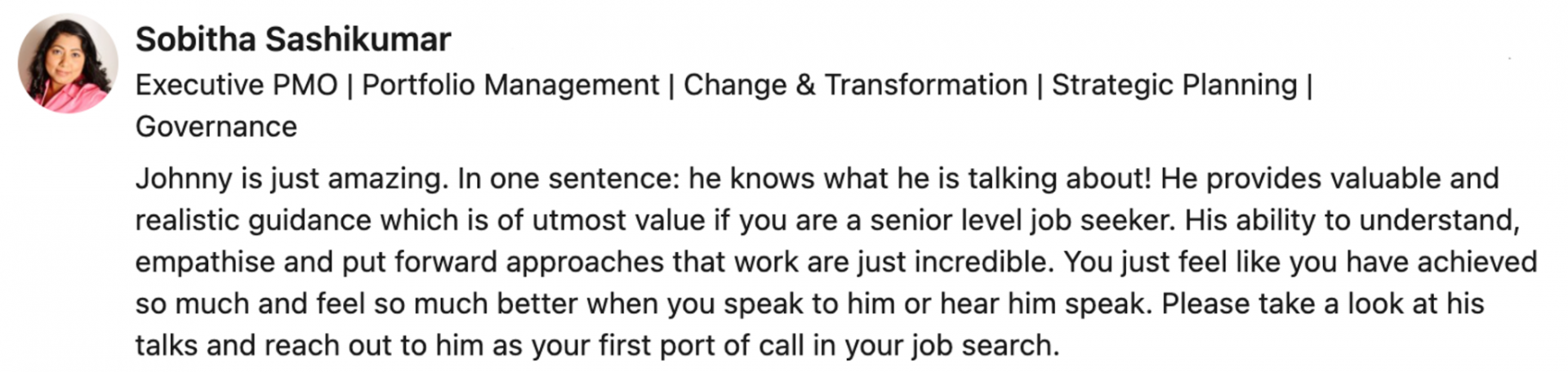 "He (Johnny) provides valuable and realistic guidance which is of utmost value if you are a senior level job seeker".